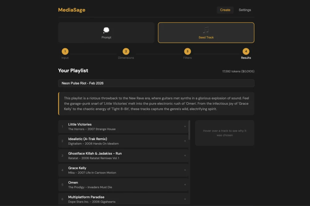 The immediate efficacy of this approach is most evident in the "Seed Track" generation feature. When using a track like Golden Skans by The Klaxons as a starting point, streaming services offer a generic historical context. MediaSage, leveraging the LLM, analyzes the seed track’s intrinsic properties—tempo, dynamic range, instrumentation—and proposes divergent interpretations of that song’s essence. The user is not presented with a single, algorithmically decided playlist but rather multiple, semantically distinct listening pathways: one focusing on genre fusion ("The Defining New Rave Sound"), another on pure kinetic energy ("High-Octane Dancefloor Energy"), and a third on specific sonic elements ("Bright, Pulsating Synth Hooks"). This granularity returns control and exploratory depth to the user, allowing them to curate the why behind the playlist, not just the what. The resulting playlist, even when incorporating tracks from disparate genres like The Prodigy alongside indie-rock contemporaries, achieves a cohesive flow dictated by the requested mood, not just database categorization.