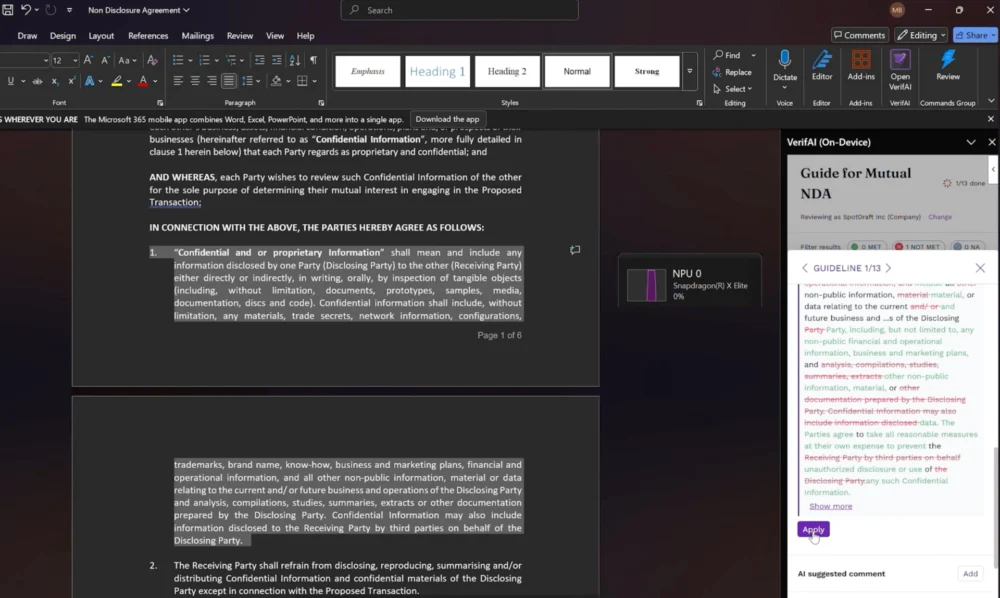 The feasibility of this approach was recently showcased at the Qualcomm Snapdragon Summit 2025, where SpotDraft successfully demonstrated the VerifAI workflow running entirely end-to-end on laptops powered by the Snapdragon X Elite platform. This demonstration confirmed the system’s ability to perform sophisticated contract review, risk scoring, and redlining functionalities fully offline. Crucially, the sensitive legal documents never leave the local machine, addressing core concerns around data residency and privileged information security. While internet connectivity remains necessary for authentication, licensing, and collaborative features, the core intelligence processing that touches the contract data operates securely at the edge.